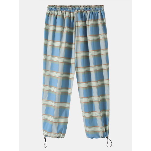 Mens Plaid Relaxed Fit Drawstring Cuff Pants With Pocket