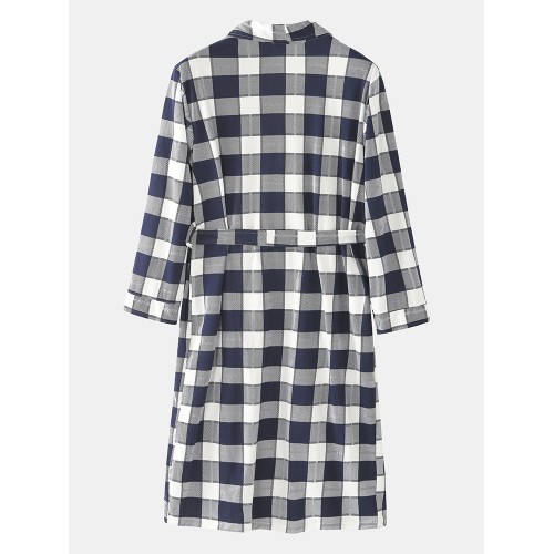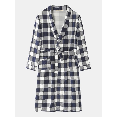 Mens Plaid Print Long Sleeve Comfy Sleepwear Bathrobe Home Robe With Pocket