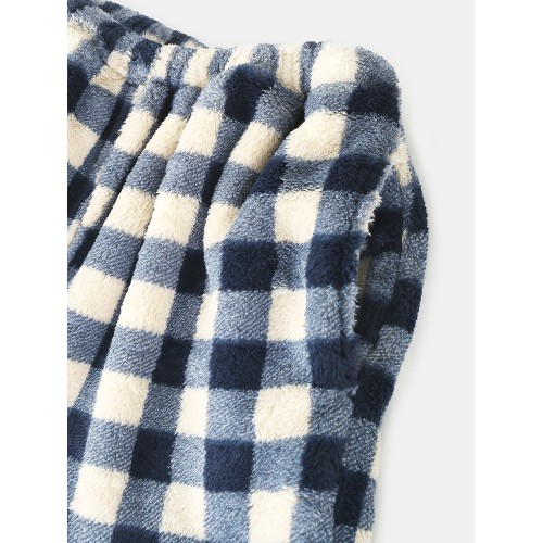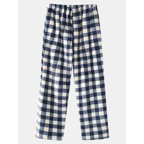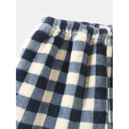 Mens Check Flannel Thicken Warm Elastic Waist Home Sleep Bottoms With Pocket