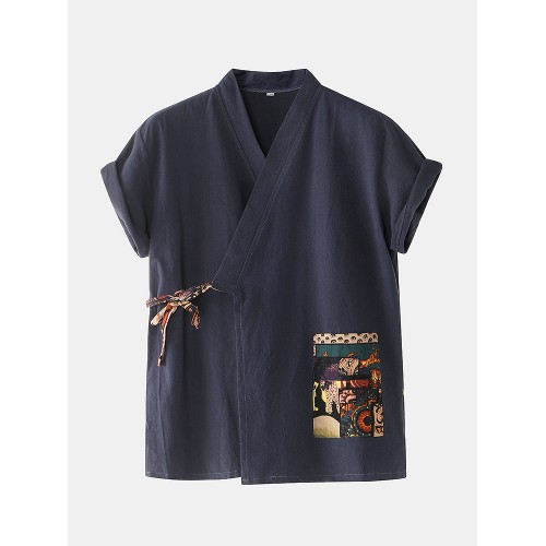 Mens Cotton Vintage Print V Neck Tie Side Kimono Relaxed Fit Short Pajamas Sets